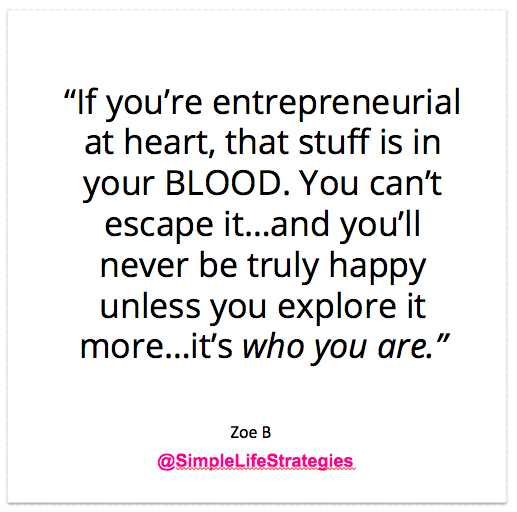 Because the thing is, if you’re entrepreneurial at heart, that stuff is in your BLOOD. You can’t escape it…and you’ll never be truly happy unless you explore it more…it’s who you are.